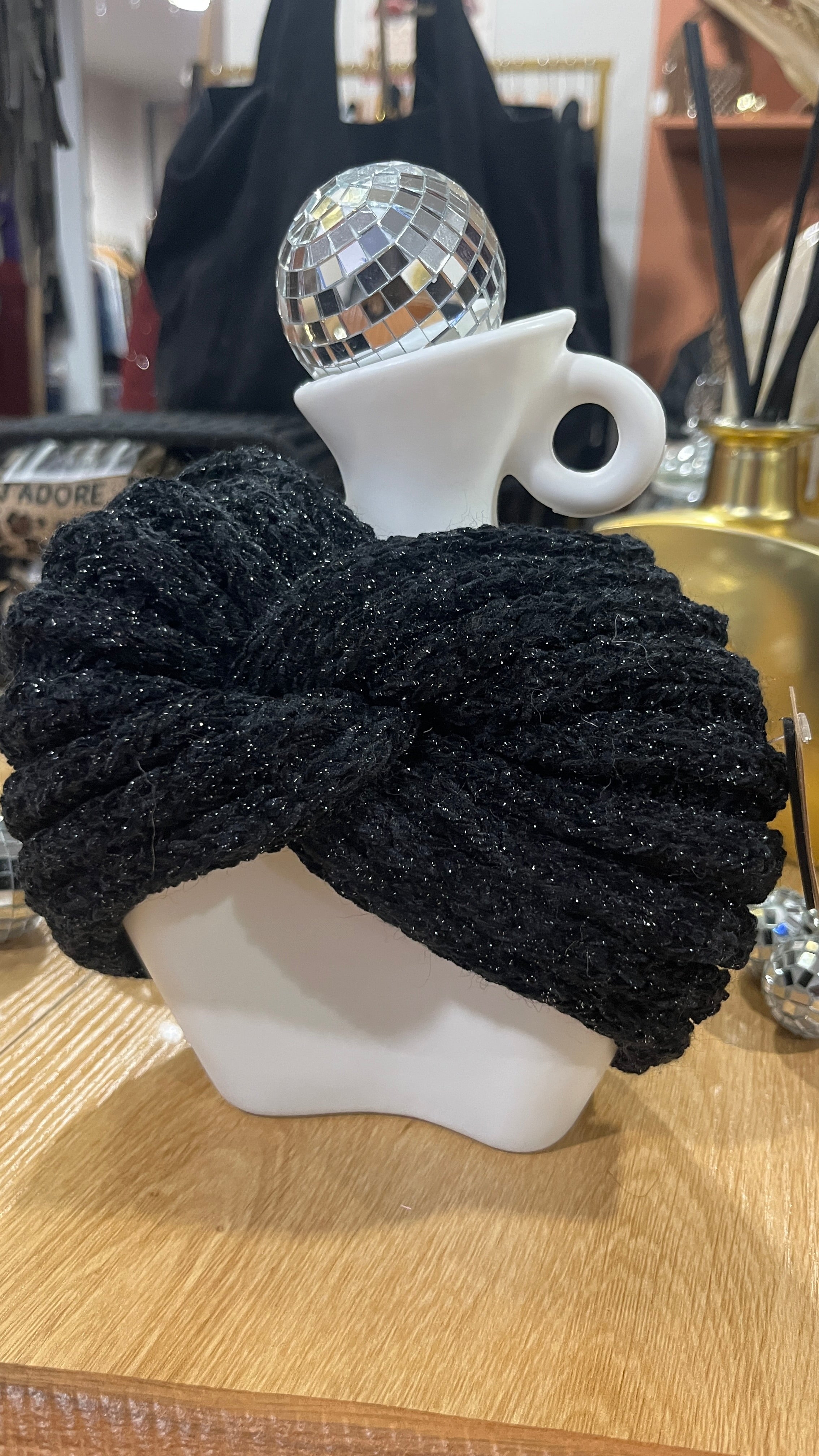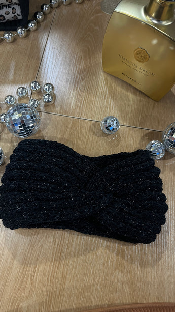 Ajoutez une touche d’élégance et de lumière à vos looks d’automne-hiver avec ce bandeau de tête torsadé noir pailleté. Son nœud central apporte une finition féminine et raffinée, tandis que les fils scintillants illuminent subtilement la coiffure.