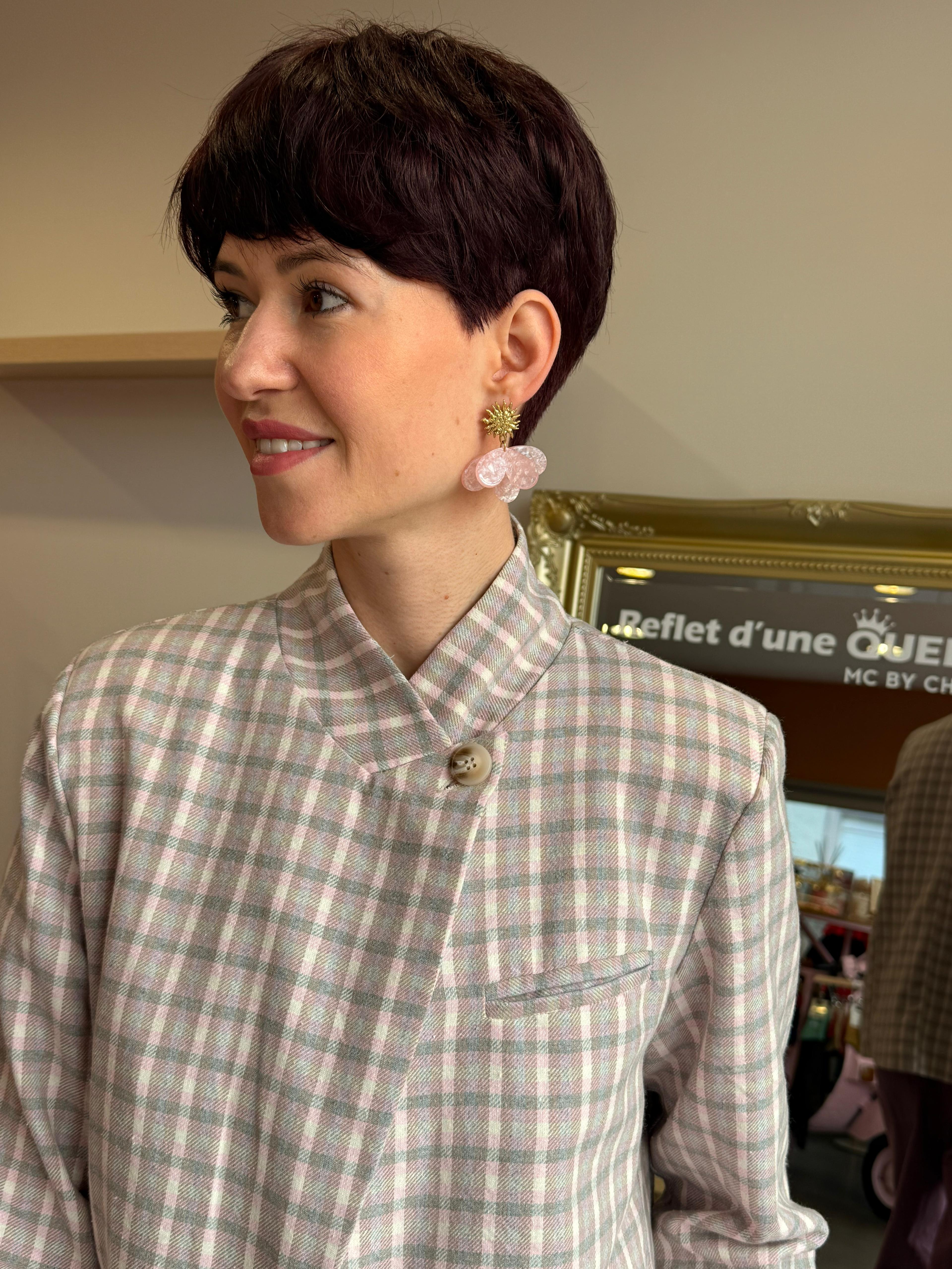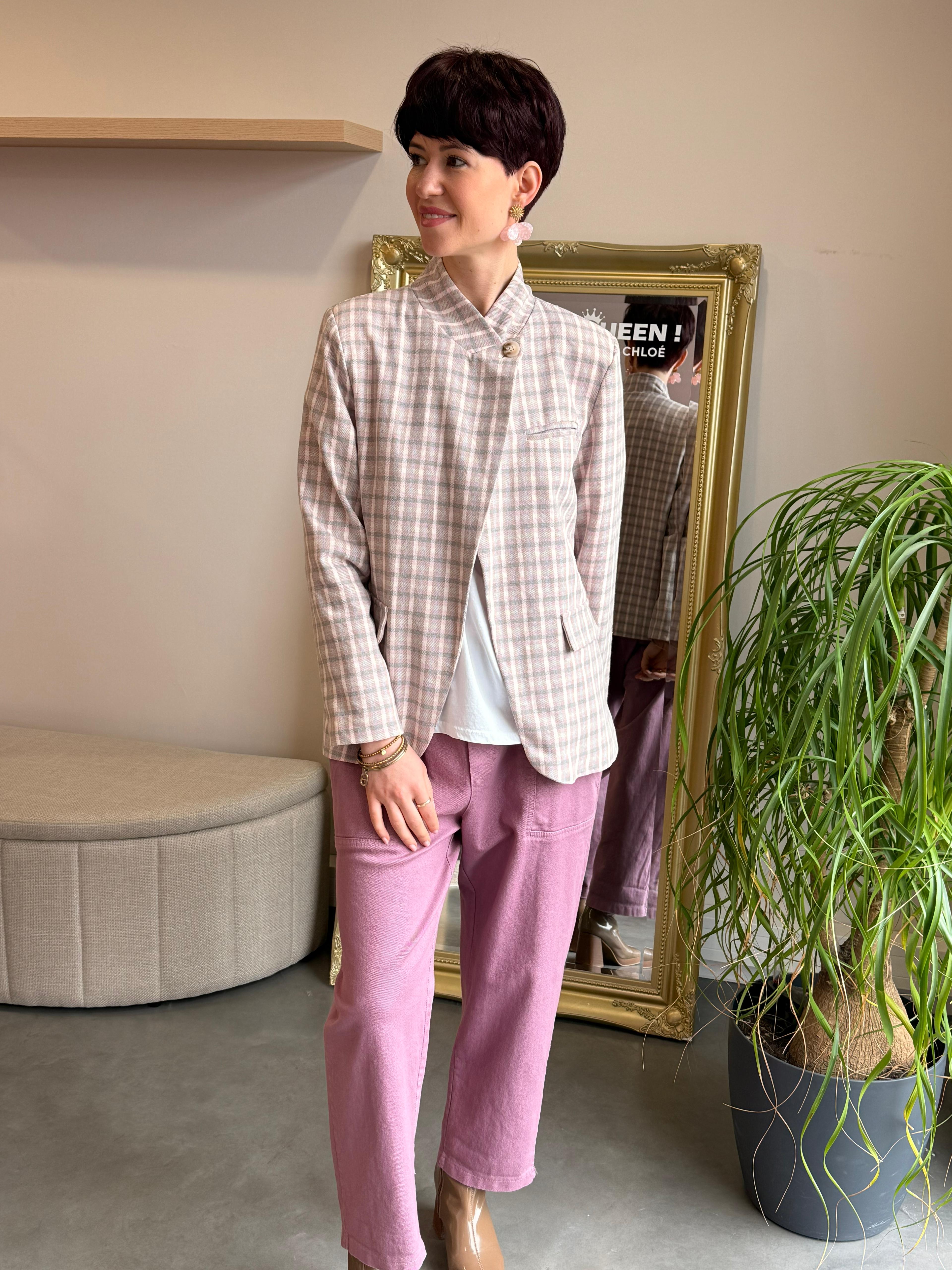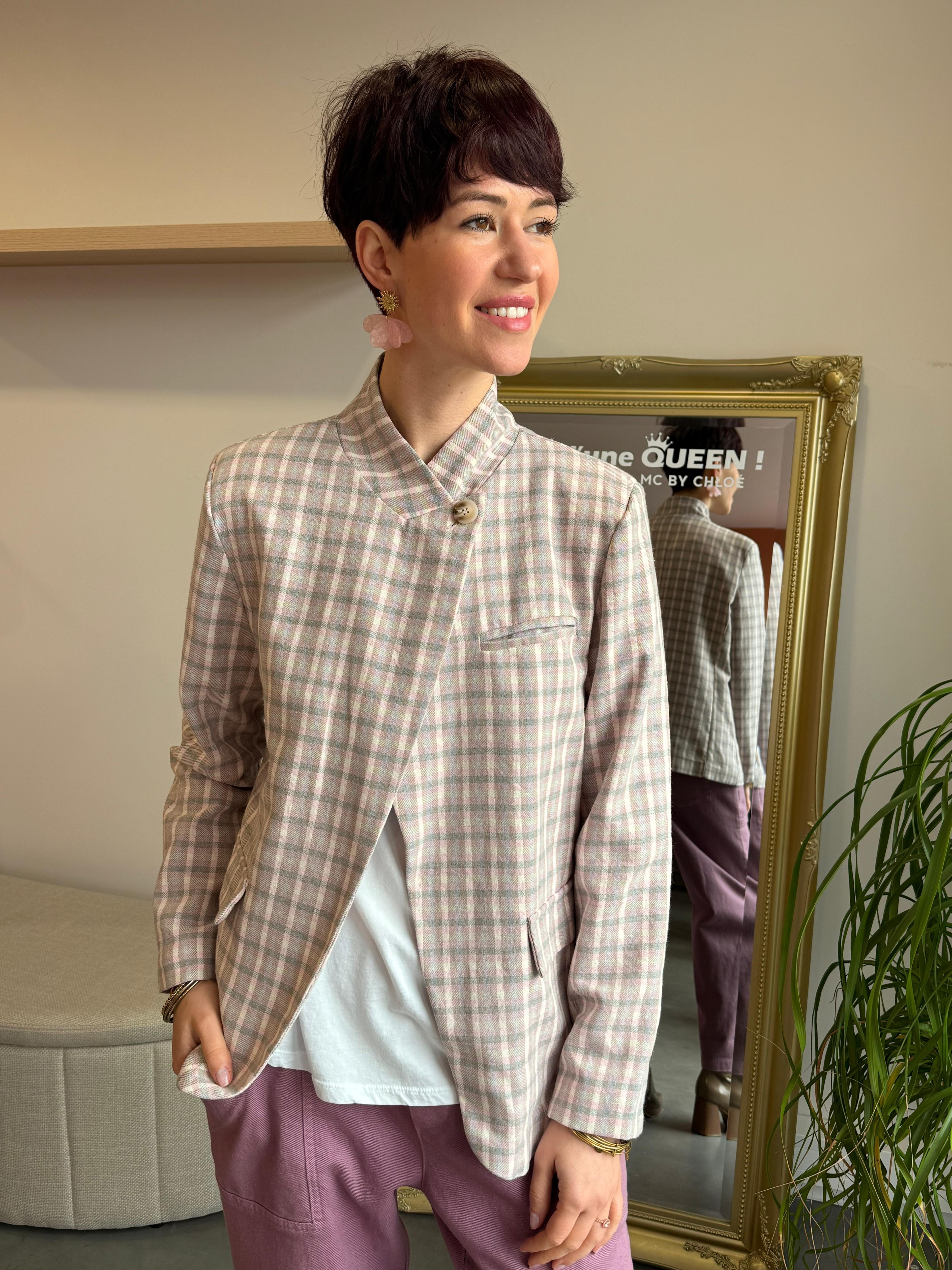Ce blazer à carreaux dans des tons doux de rose et beige séduit par sa coupe structurée et son style intemporel.