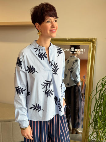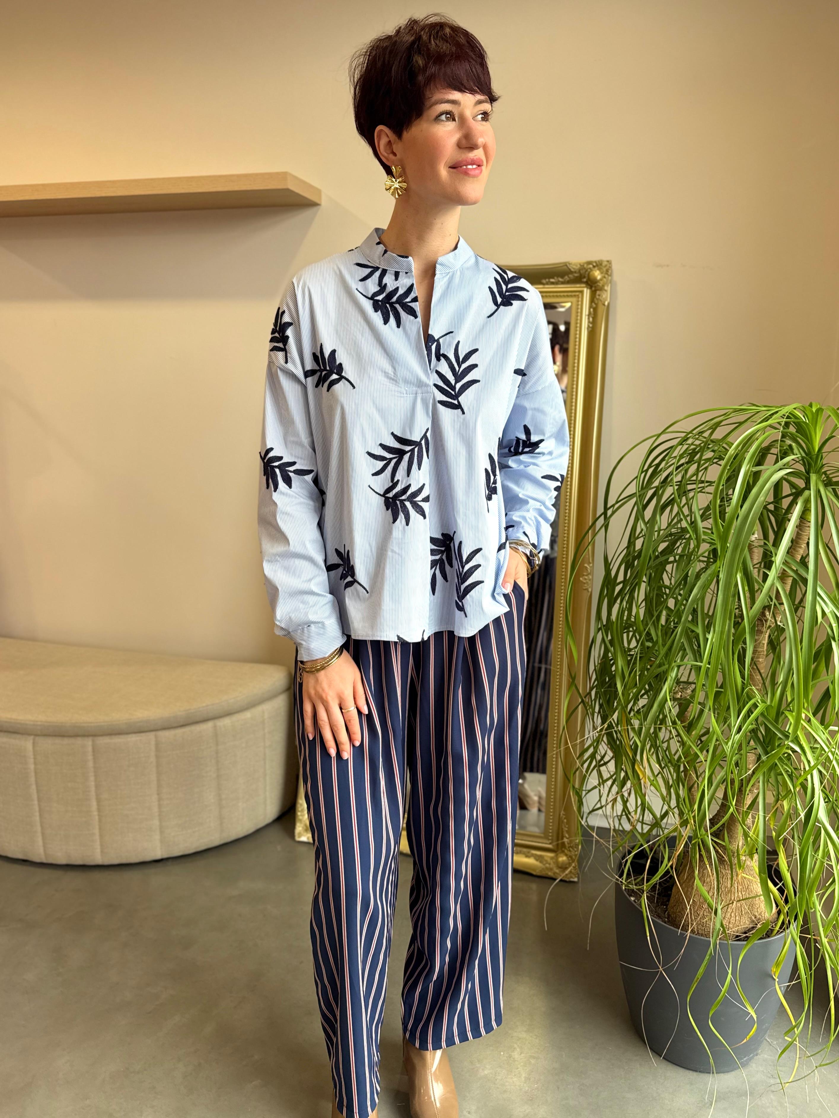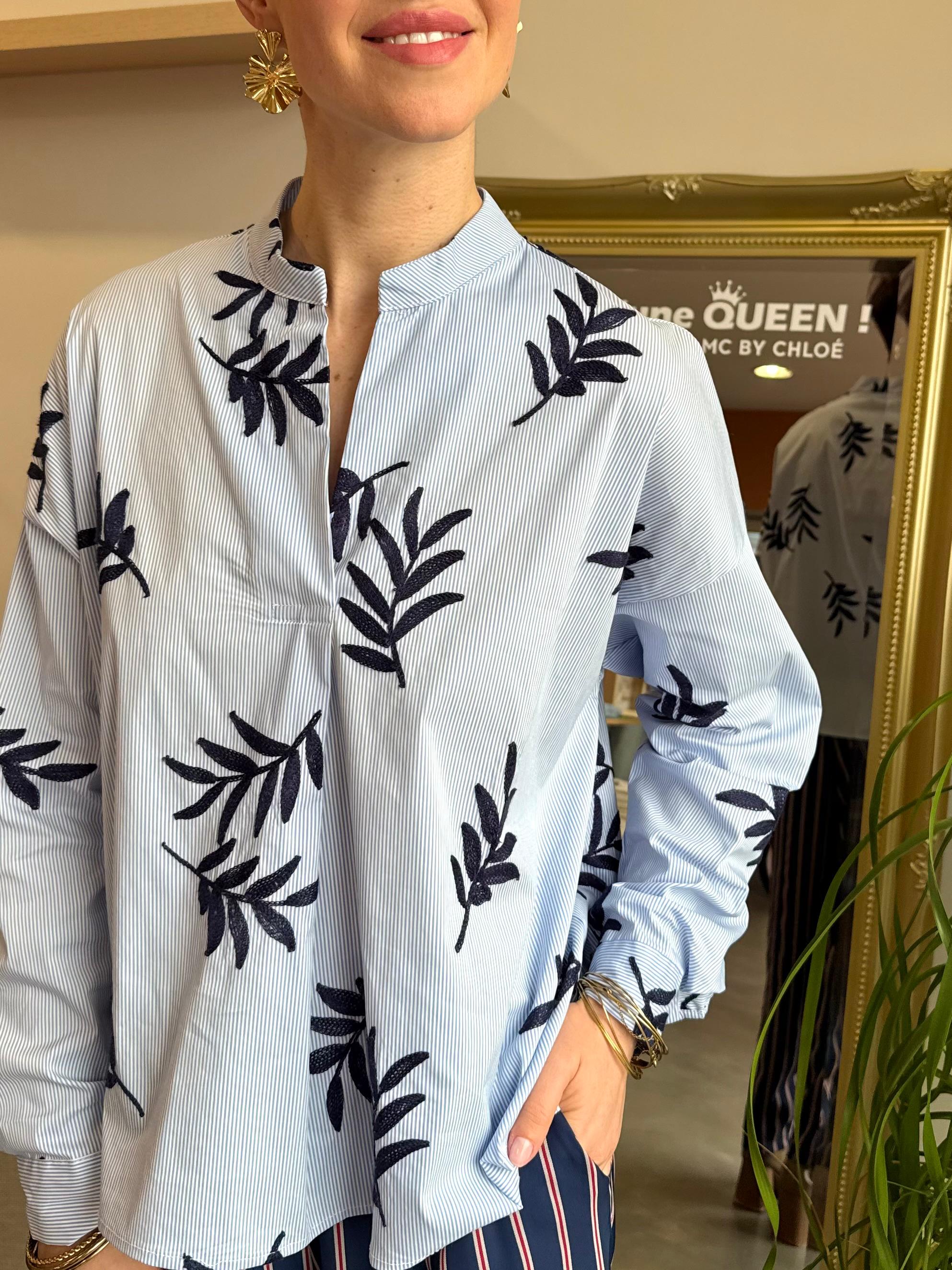On craque pour ses fines rayures associées à de jolies broderies marine en relief, qui apportent du charme et du caractère à la pièce.