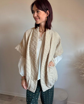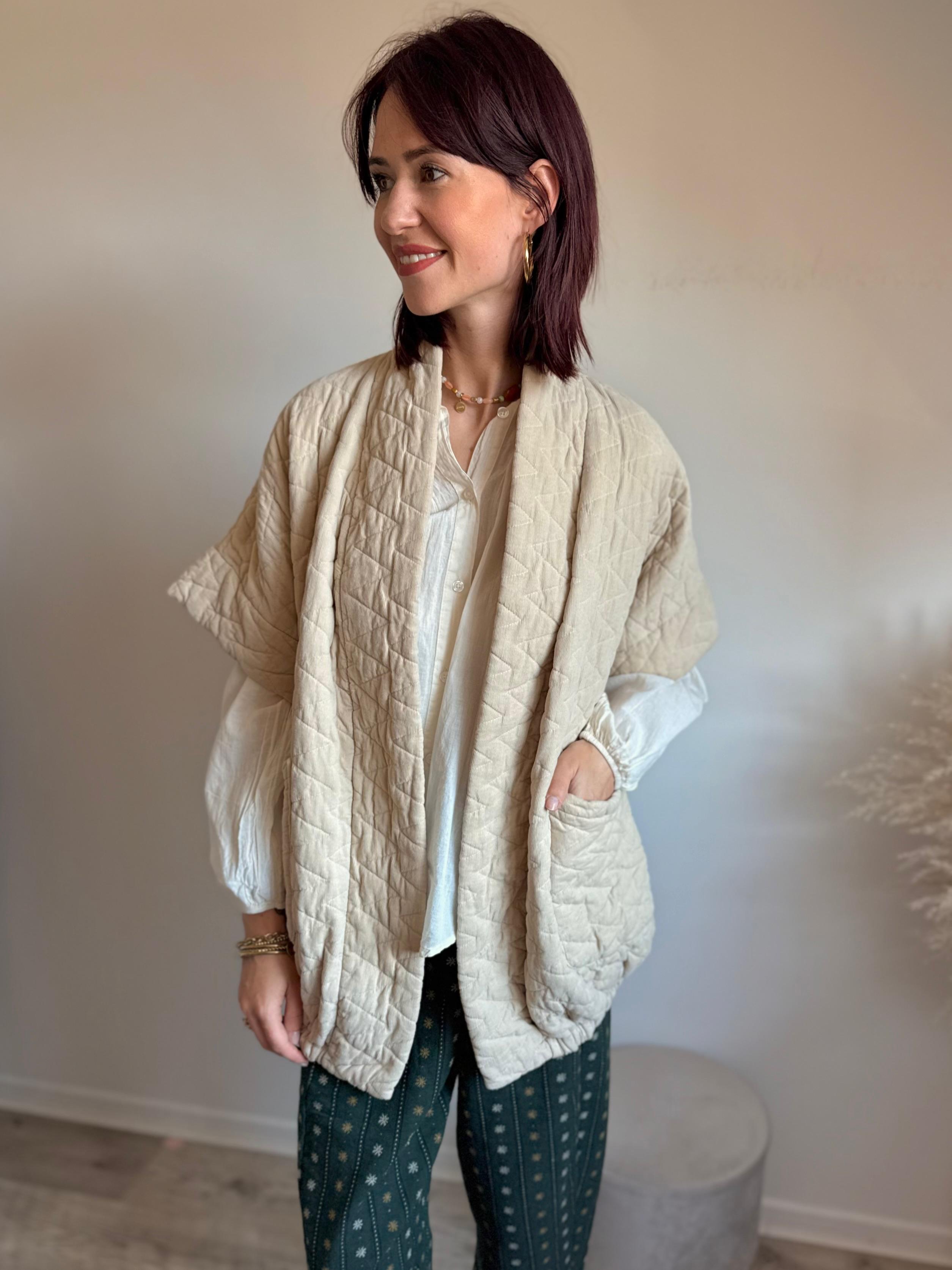 Confectionnée dans un velours écru d’une douceur incomparable, elle séduit par son matelassage raffiné et sa coupe kimono aux manches courtes. Légère mais élégante, elle se porte aussi bien ouverte sur une chemise qu’ajustée avec une ceinture pour souligner la taille.