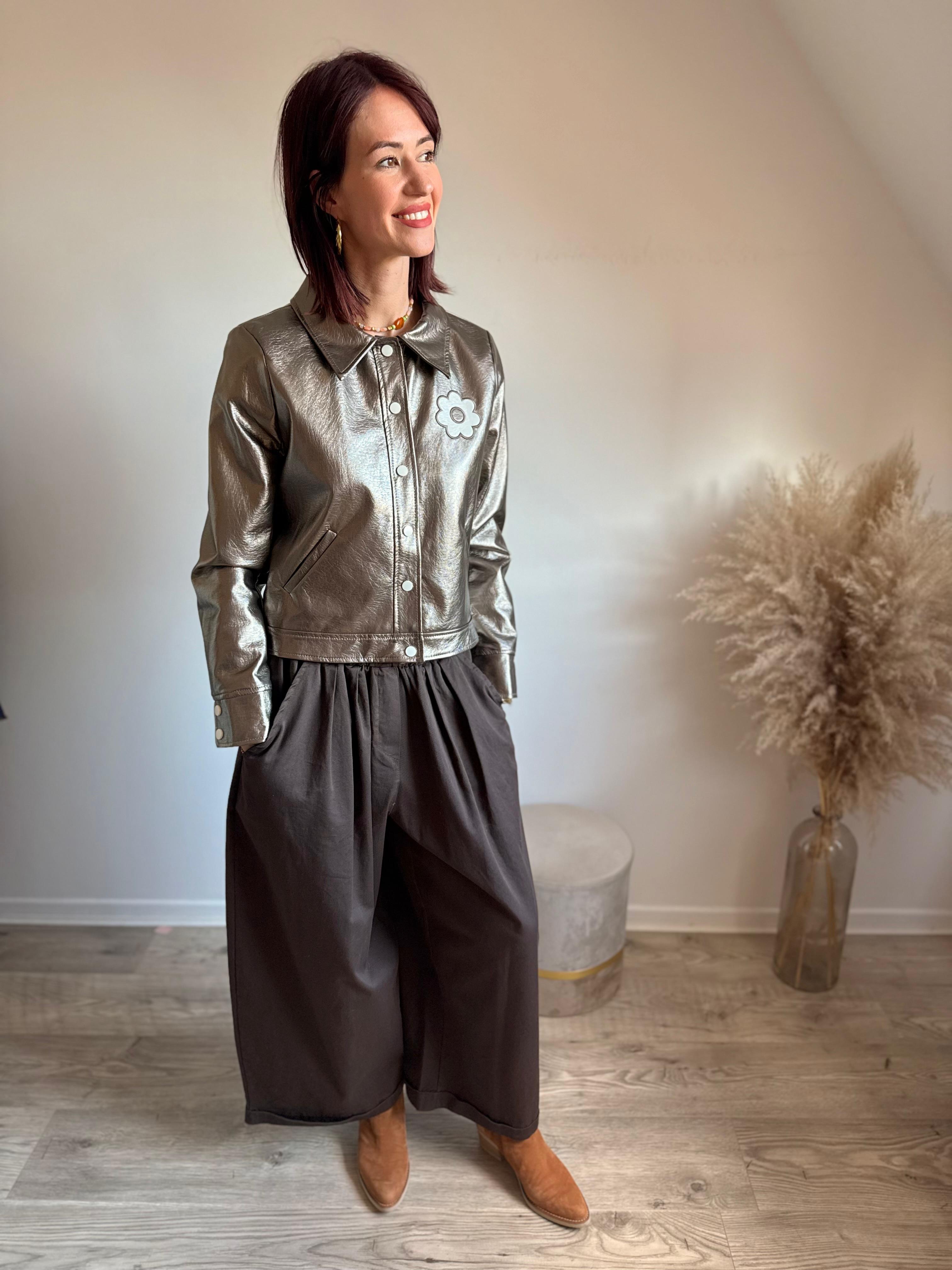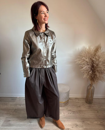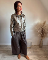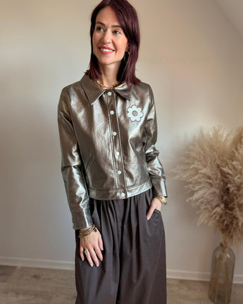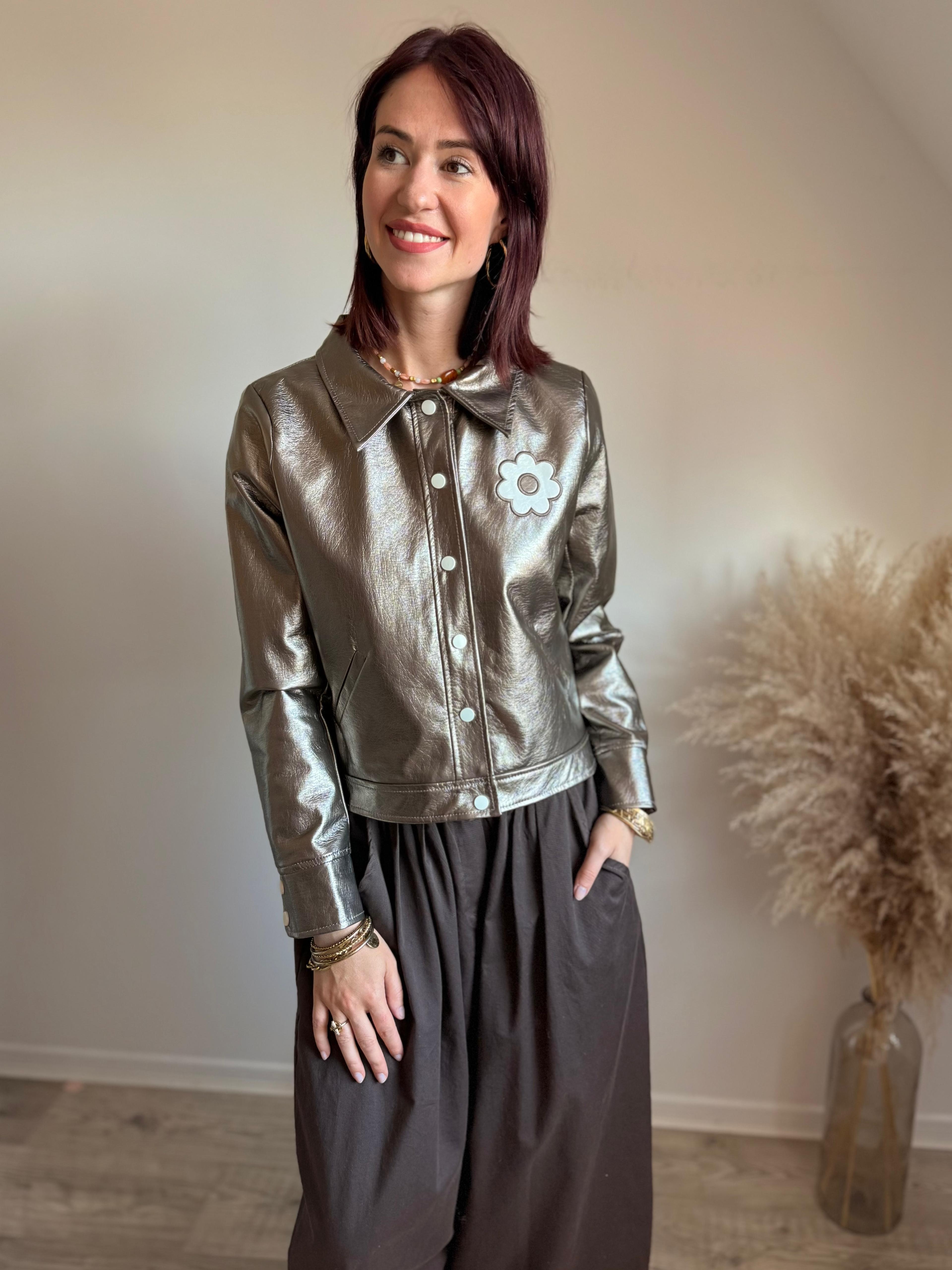 Apportez une touche d’audace à vos looks avec cette veste en vinyle coloris mordoré, signée par une marque française qui mise sur l’originalité et la tendance.