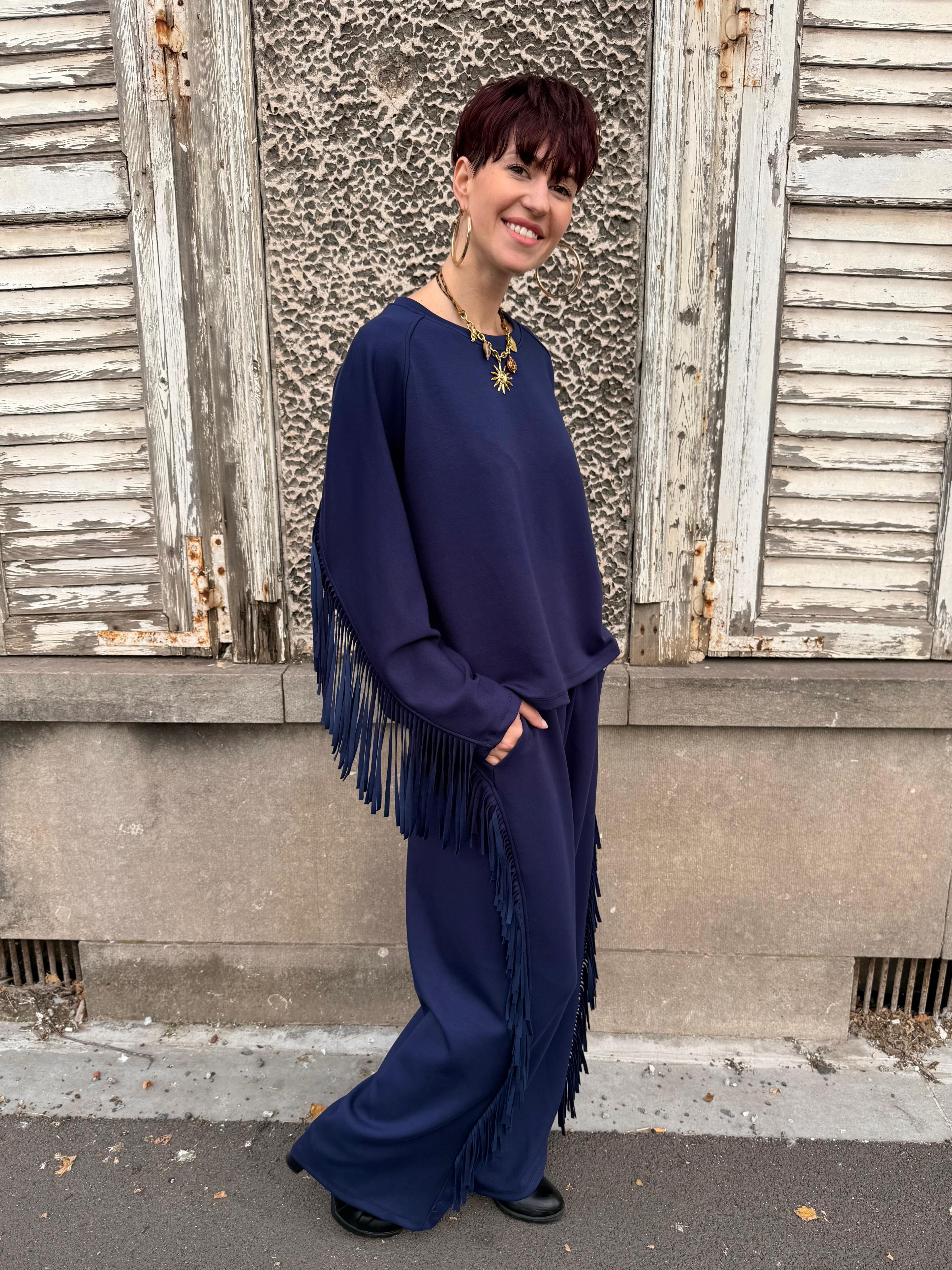 Un look à la fois chic, décontracté et plein de style, sublimé par ses franges bohèmes sur les manches et le long du pantalon.