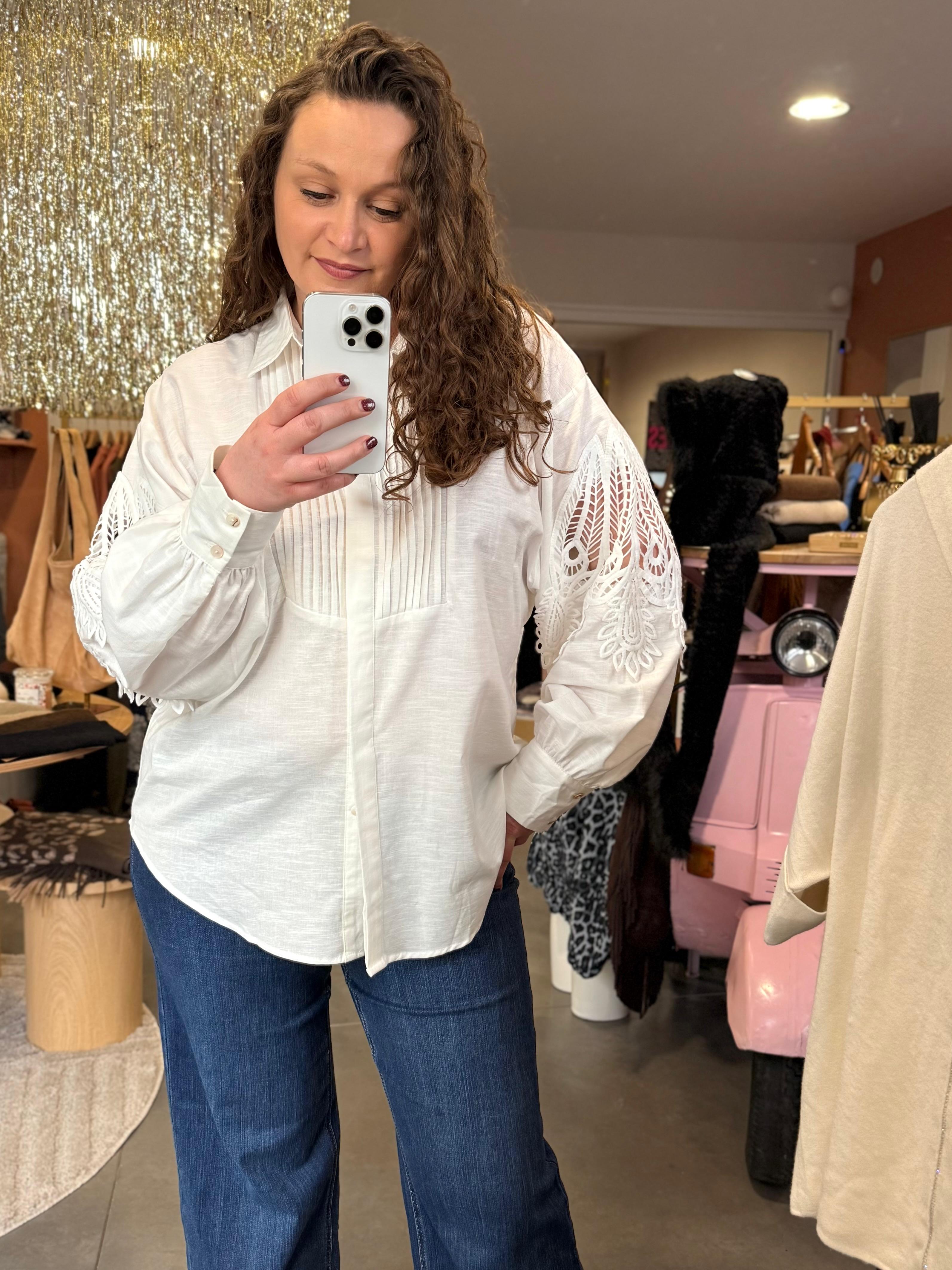 On adore ses manches brodées ajourées, délicates et féminines, qui apportent du caractère à la tenue. Le plastron plissé sur le devant structure joliment le buste et donne une allure chic et soignée.