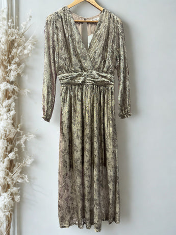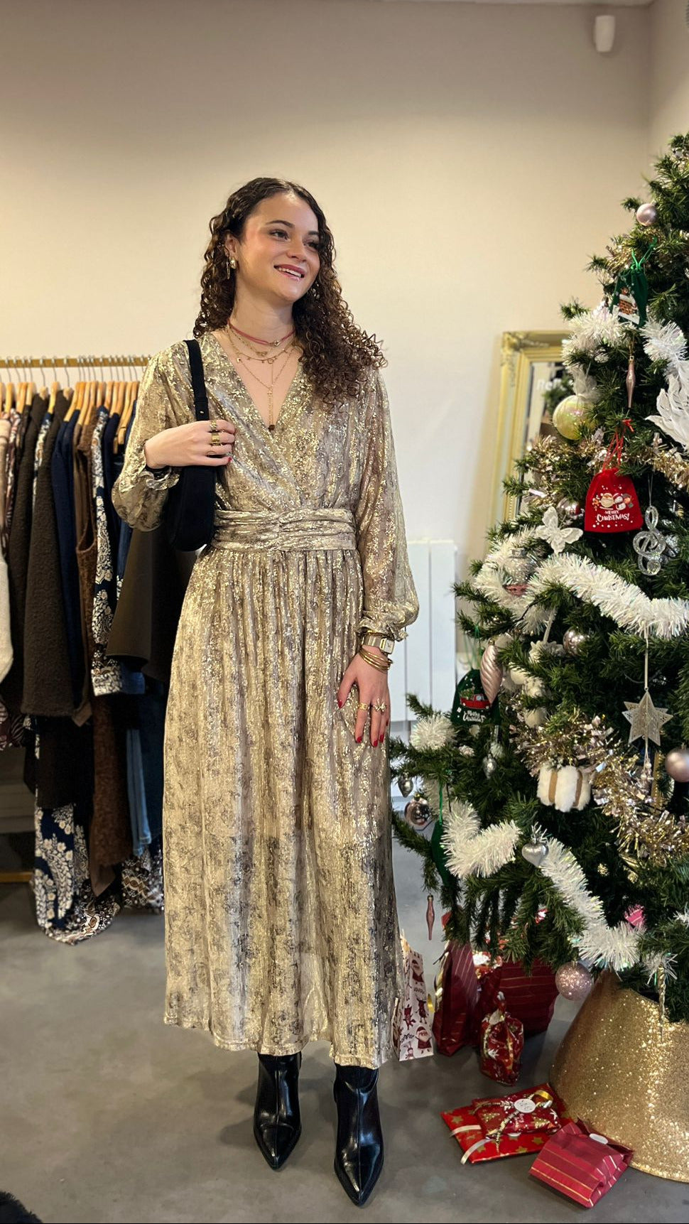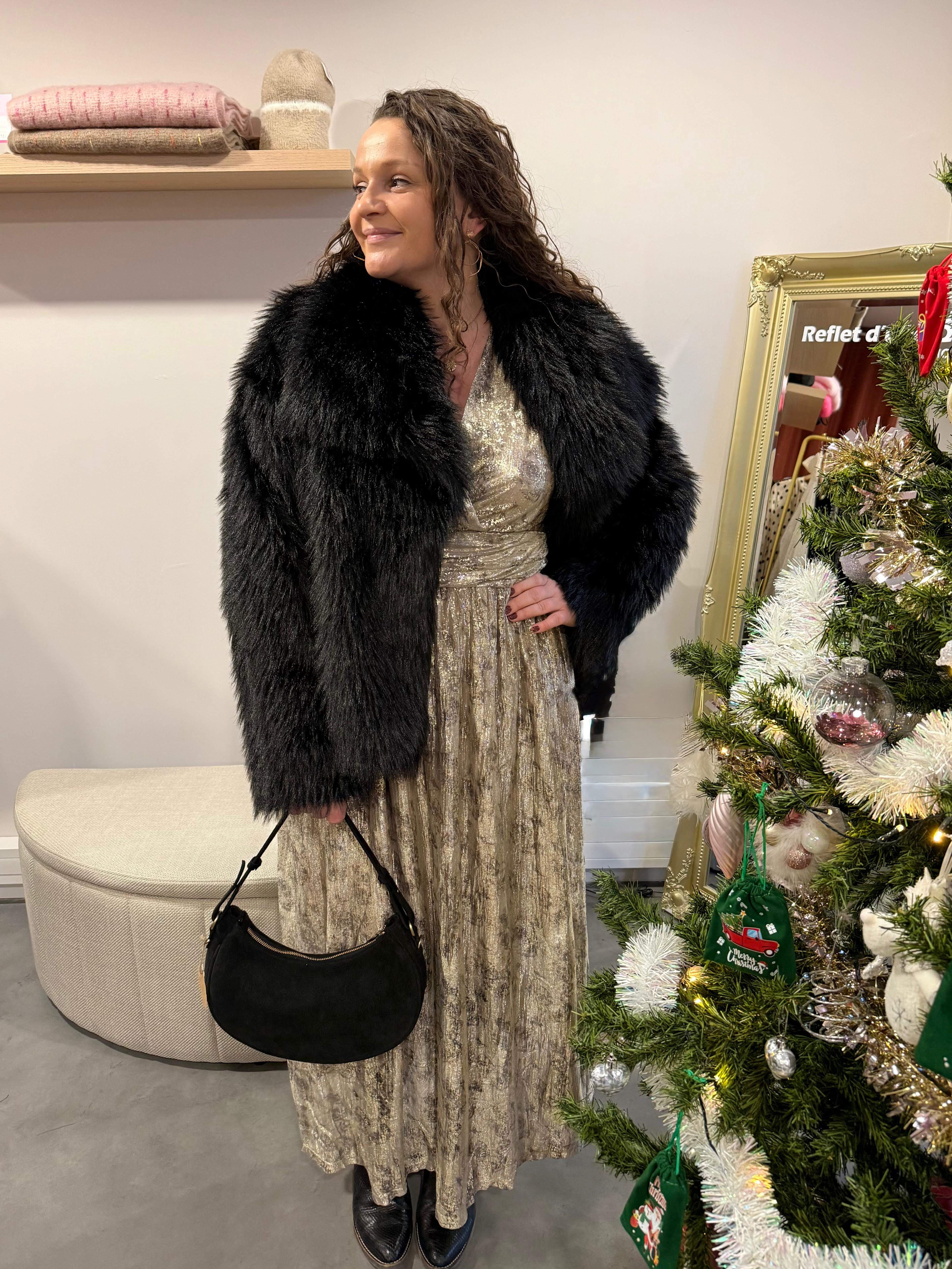 Sublime et féminine, cette robe longue brillante est parfaite pour illuminer vos soirées. Sa coupe élégante met en valeur les formes tout en offrant un tombé fluide et confortable, avec une matière scintillante chic et discrète.