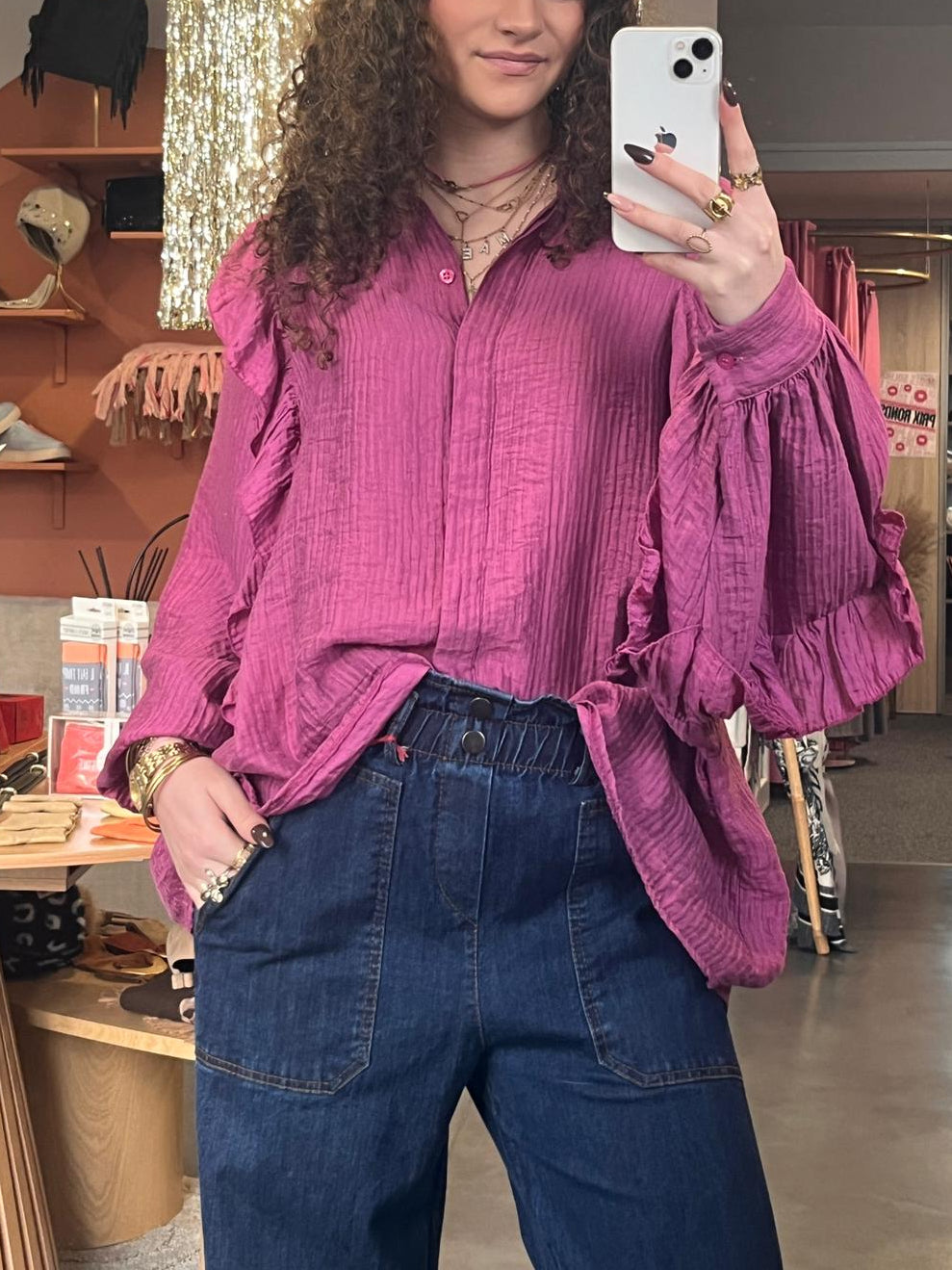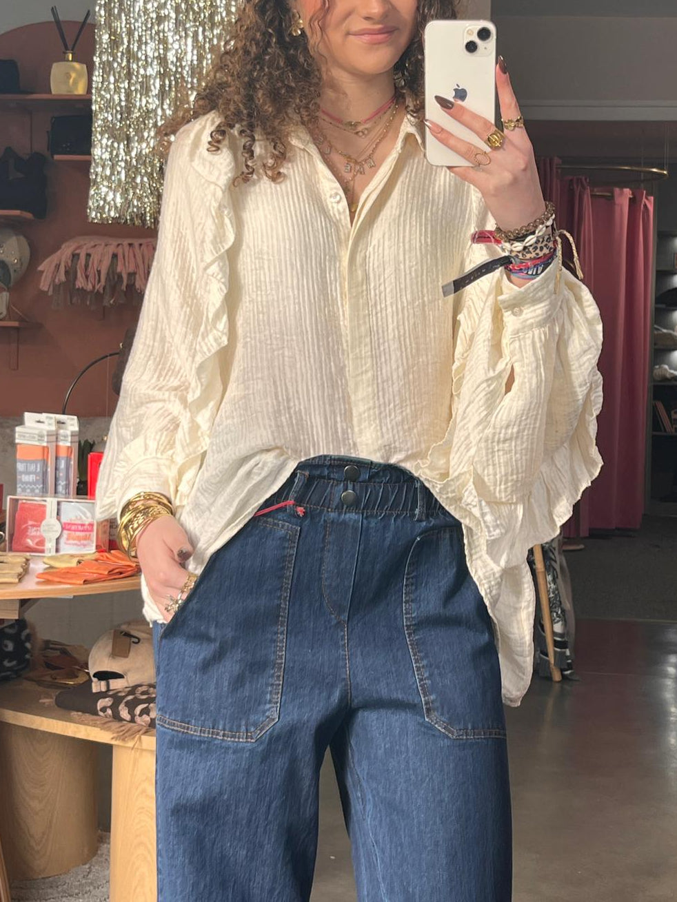Portez-le rentré dans un jean large à taille haute pour un look urbain chic, ou laissez-le flou sur un pantalon ajusté pour une allure plus bohème. Les poignets élastiqués vous permettent de remonter les manches pour accentuer l'effet bouffant selon vos envies.