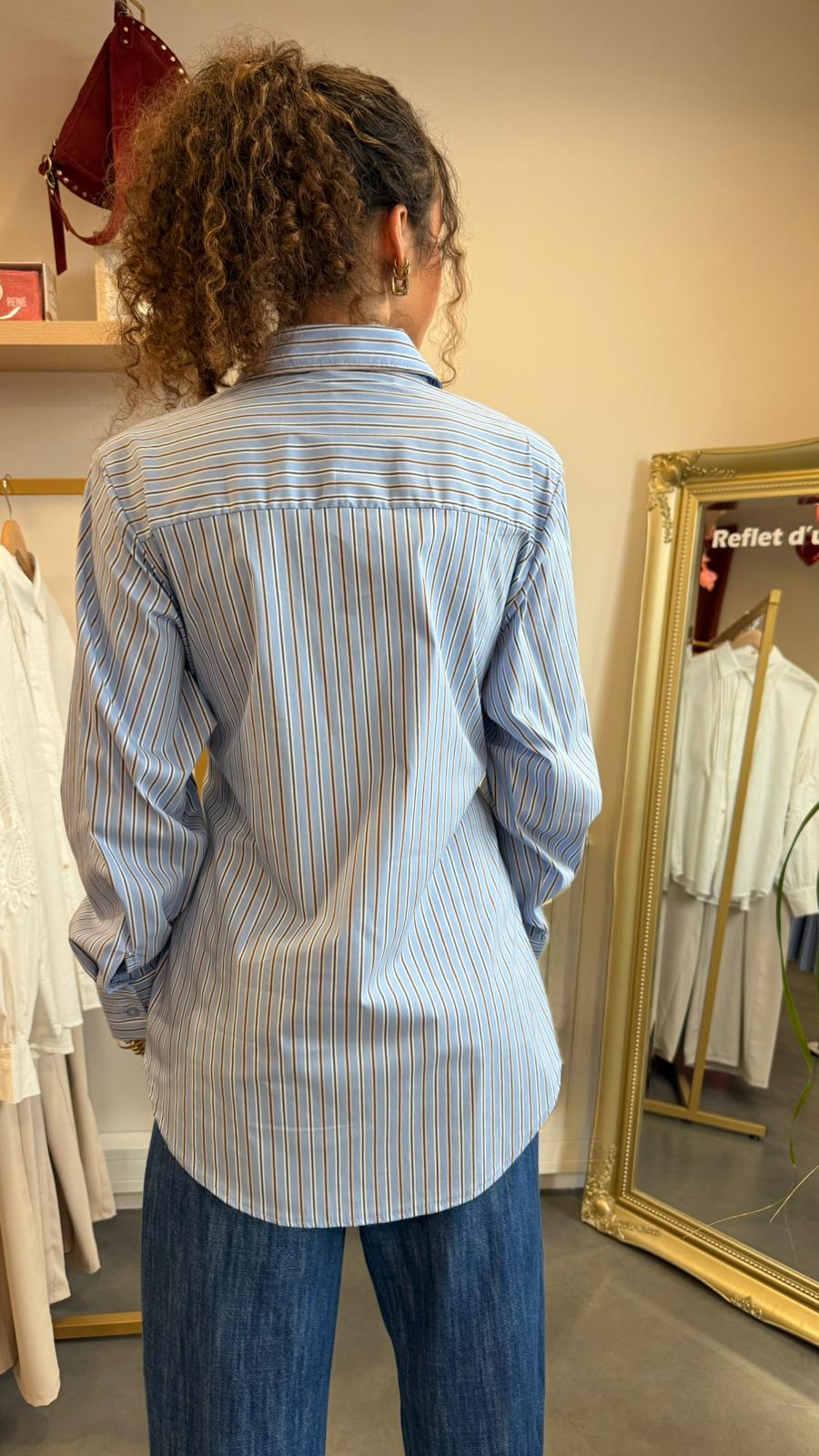 - Un motif à fines rayures verticales bleu ciel, blanc et ocre qui allonge la silhouette. Elle possède un col chemise traditionnel, une patte de boutonnage classique et des poignets boutonnés soignés.