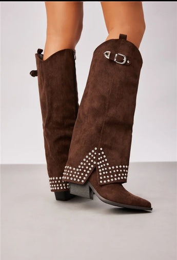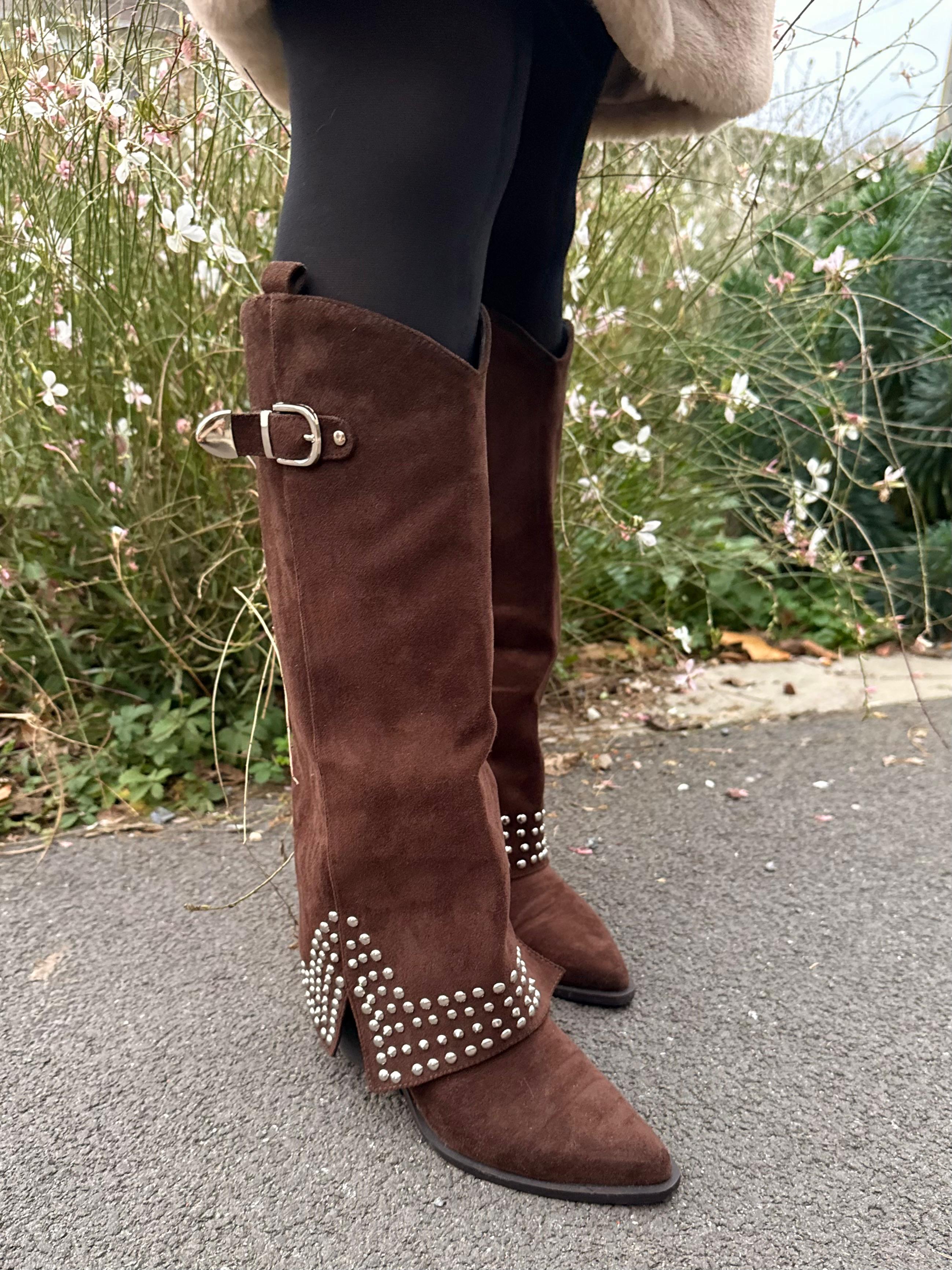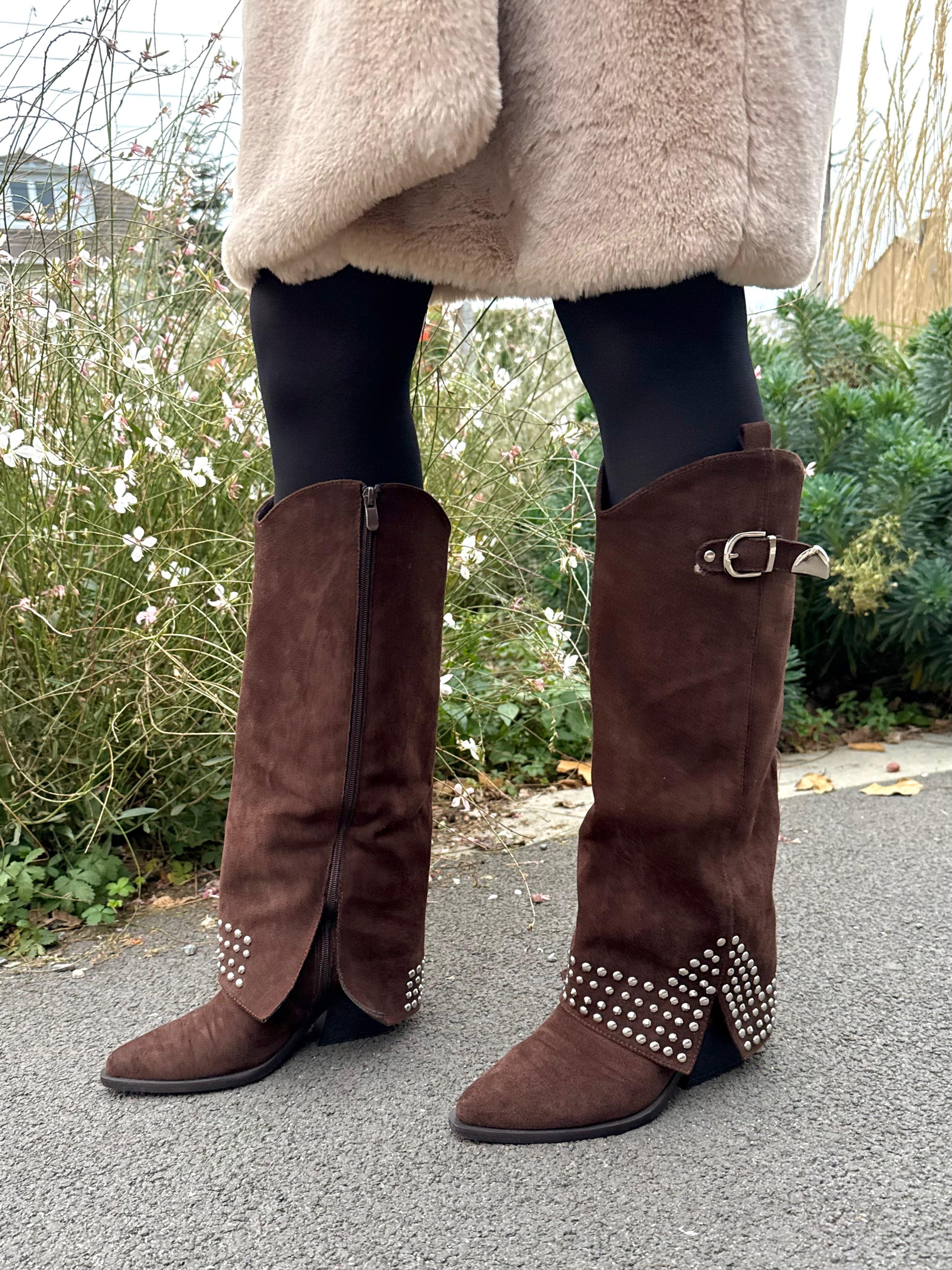 Craquez pour l’esprit cowgirl chic avec nos bottes santiag à clous en suédine chocolat 🤎.