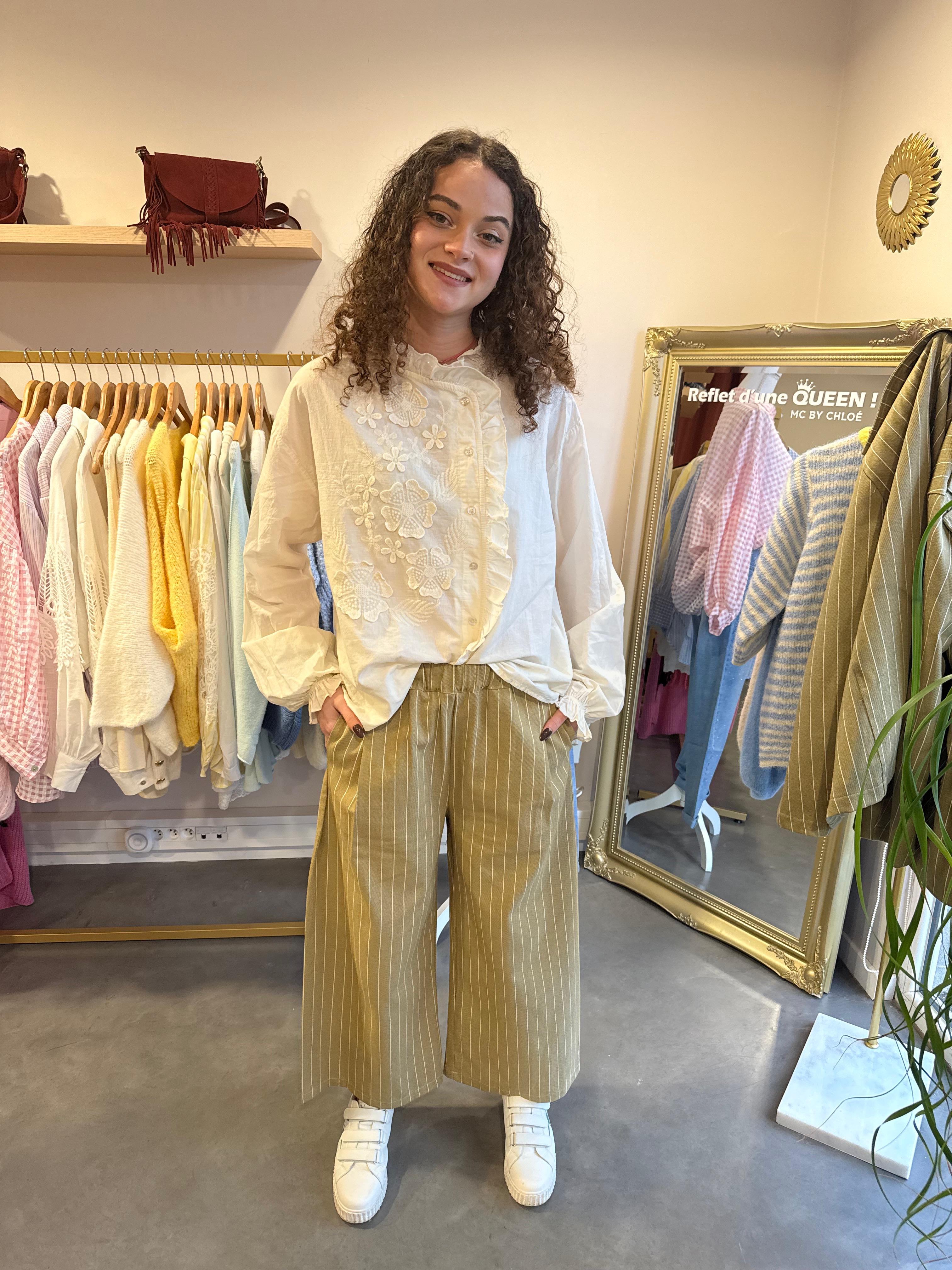 Pantalon : Taille haute avec passants, 7/8ème, plis plats (pinces) pour un volume élégant et poches italiennes.
