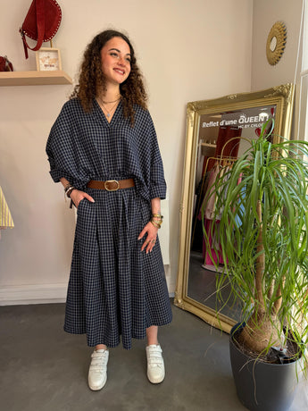 Affirmez votre style avec cet ensemble coordonné de la marque Johanna Paris. Composé d'une jupe midi ceinturée et d'un top à la coupe audacieuse, cet ensemble incarne parfaitement la tendance "effortless chic". Son motif à petits carreaux graphiques bleu marine et blanc apporte une structure visuelle moderne tout en conservant une allure fluide et vaporeuse.