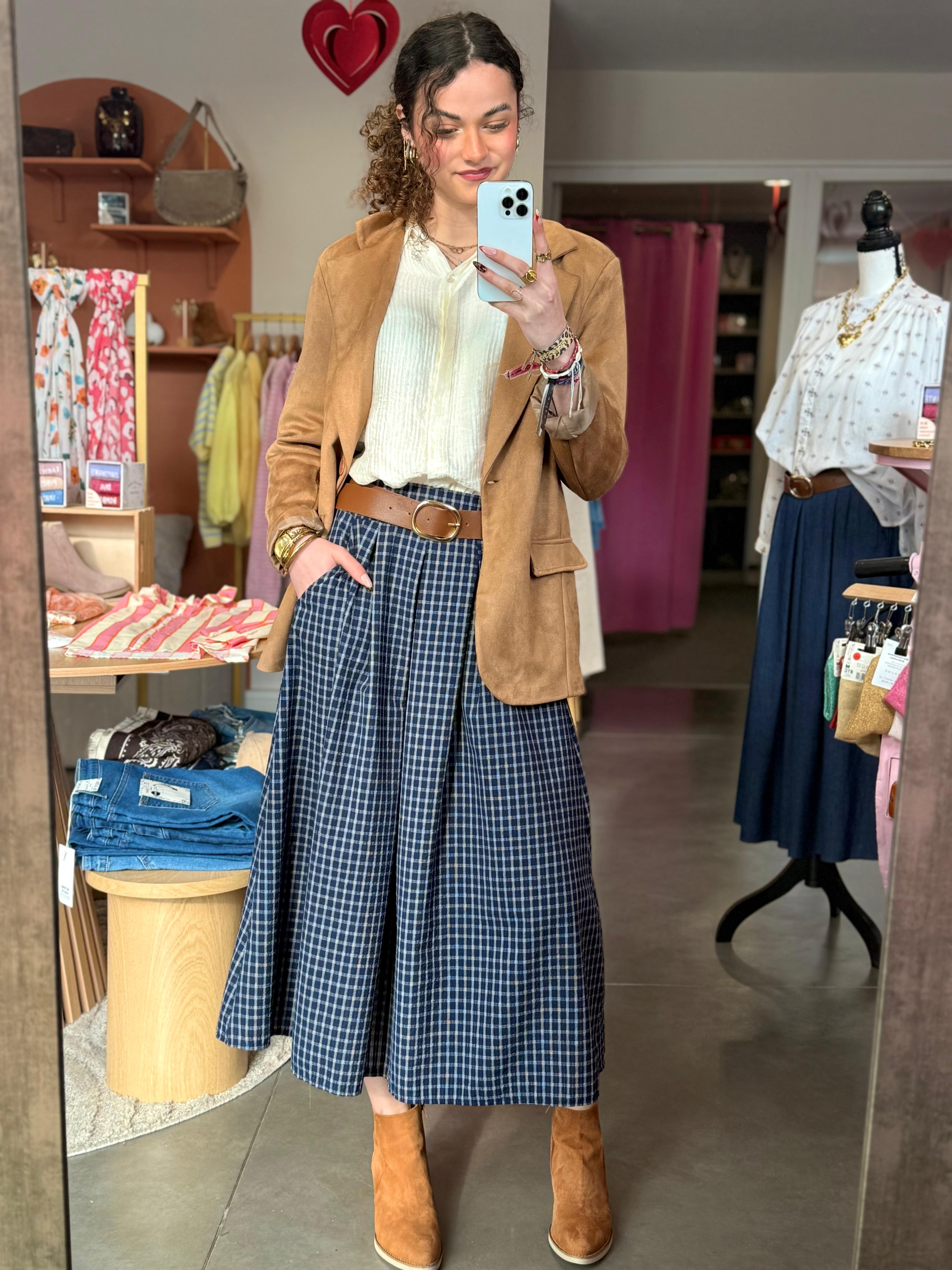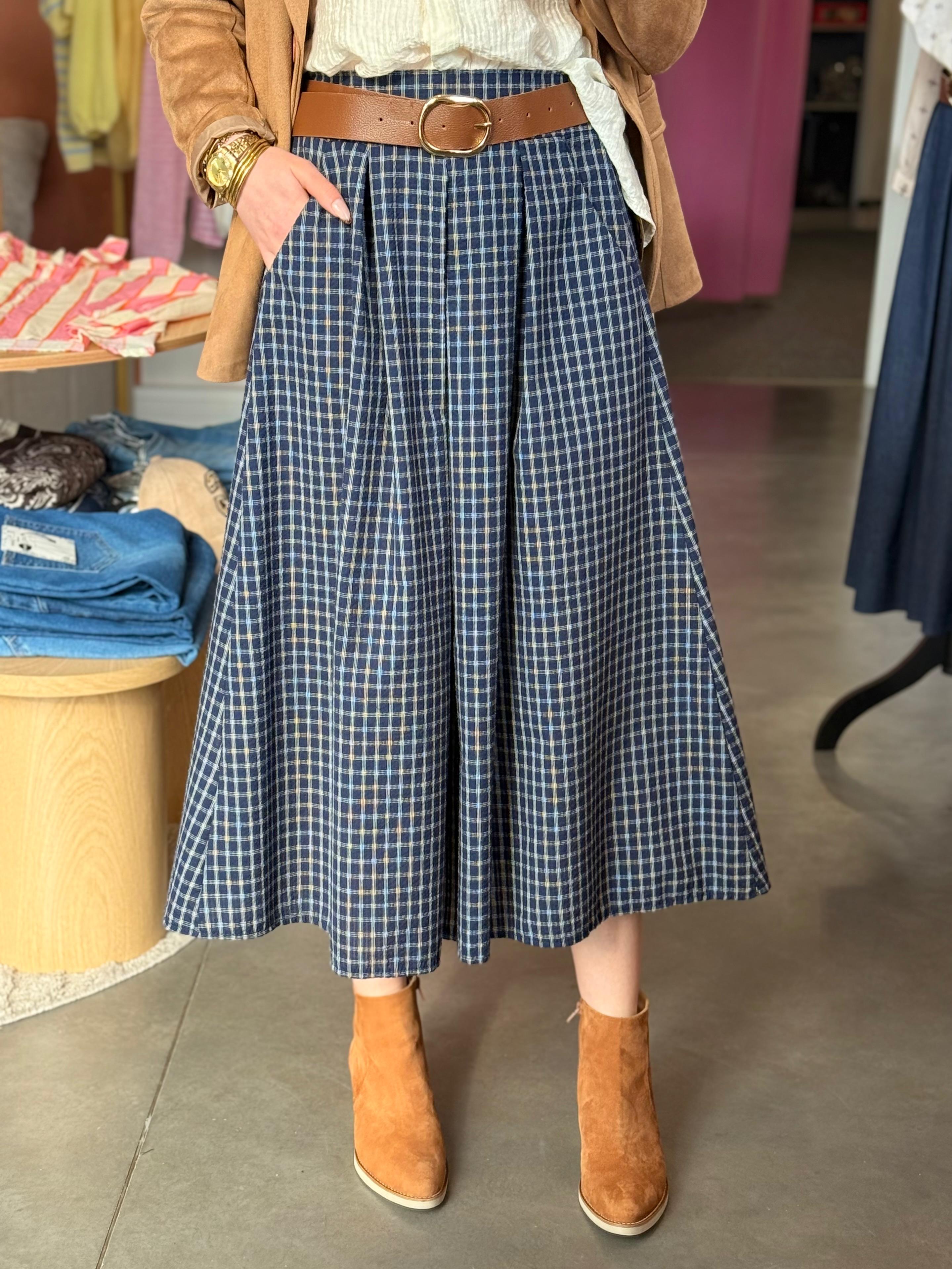 Affirmez votre style avec cette jupe de la marque Johanna Paris. Cette jupe midi ceinturée incarne parfaitement la tendance "effortless chic". Son motif à petits carreaux graphiques bleu marine et blanc apporte une structure visuelle moderne tout en conservant une allure fluide et vaporeuse.