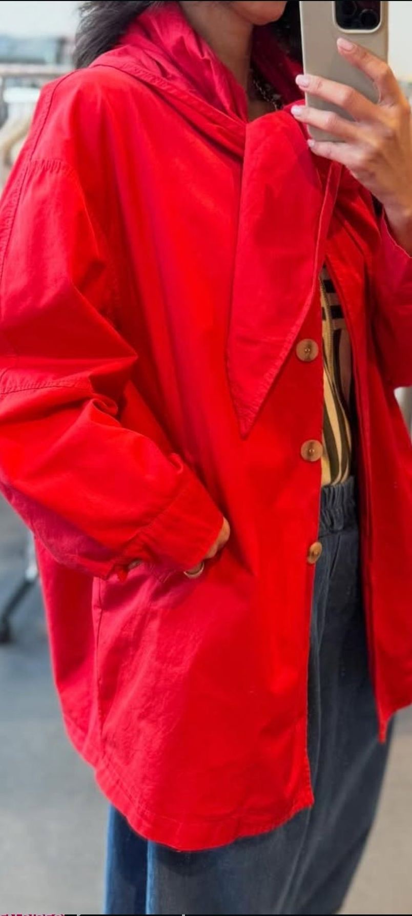 Cet imperméable signé Johanna Paris revisite le coupe-vent classique avec une touche très mode : un petit foulard triangle intégré qui habille immédiatement la silhouette. Il structure le haut du corps et donne un style chic sans effort… même sur une tenue toute simple.