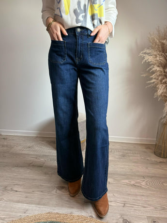 Nouveau Jean brut, deux poches plaquées sur le devant, jambes larges et bonne longueur.
