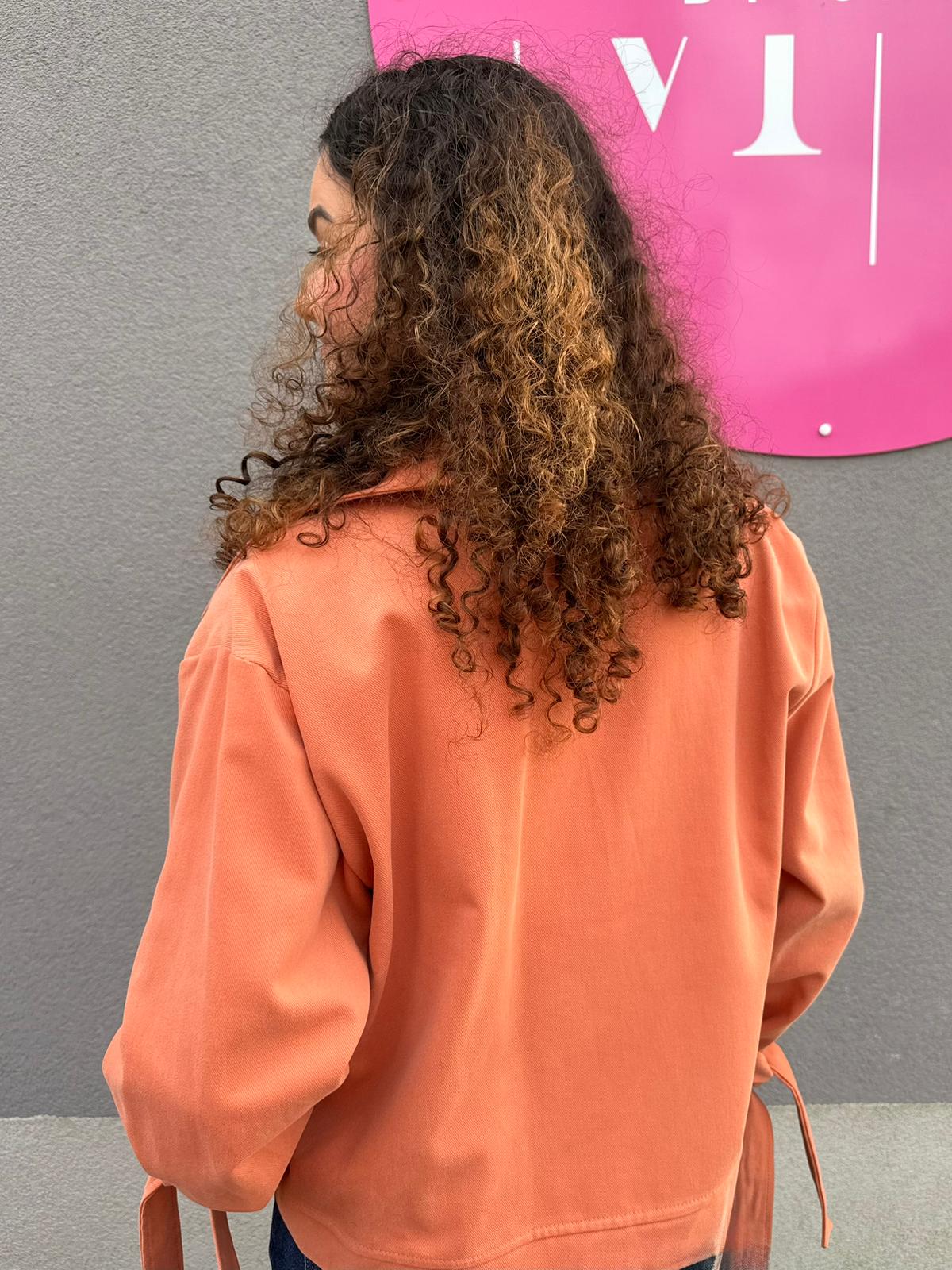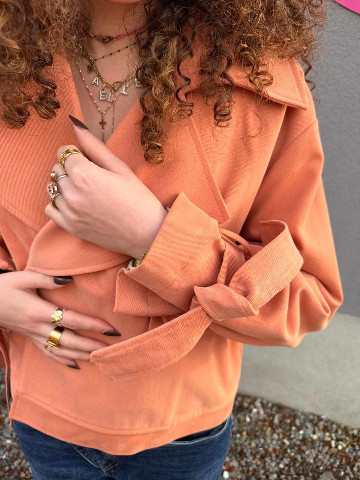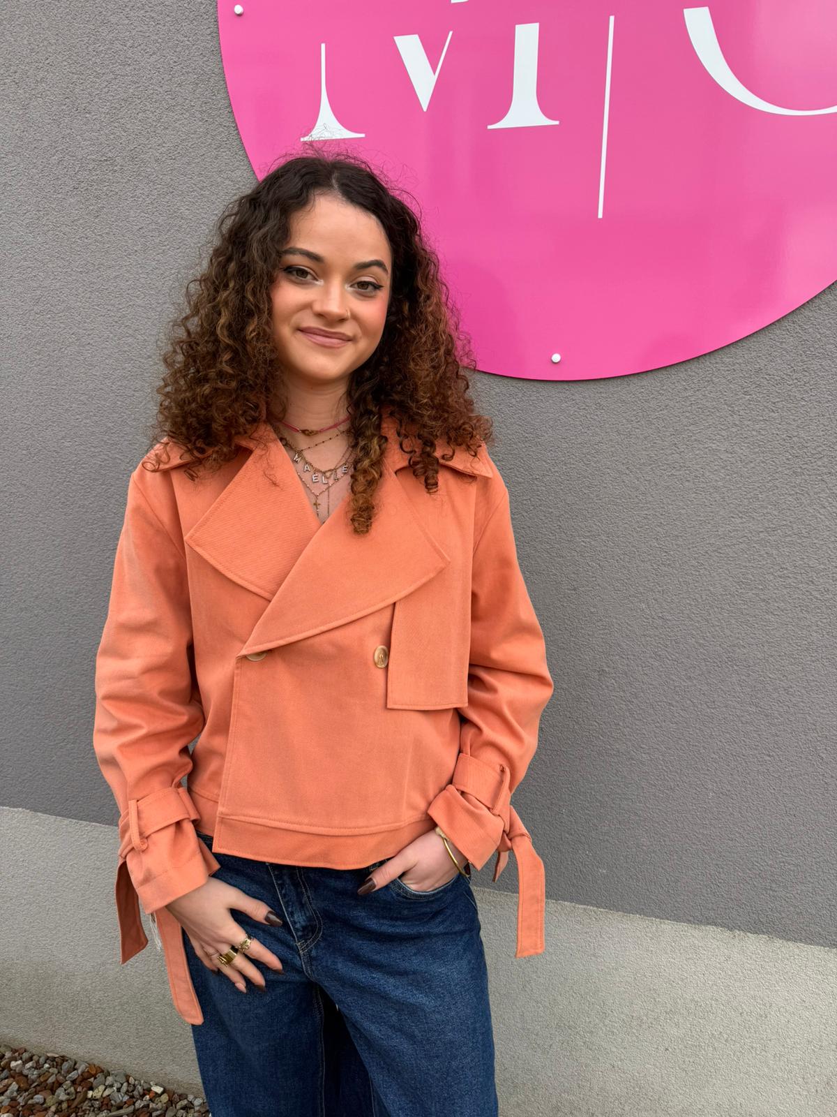 Cette veste courte est la pièce idéale pour celles qui recherchent un vêtement de mi-saison avec du caractère. Elle réinterprète les codes du trench traditionnel dans une version moderne et dynamique. Son coloris papaye vibrant apporte une dose instantanée de bonne humeur et de lumière à votre vestiaire.