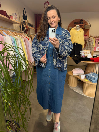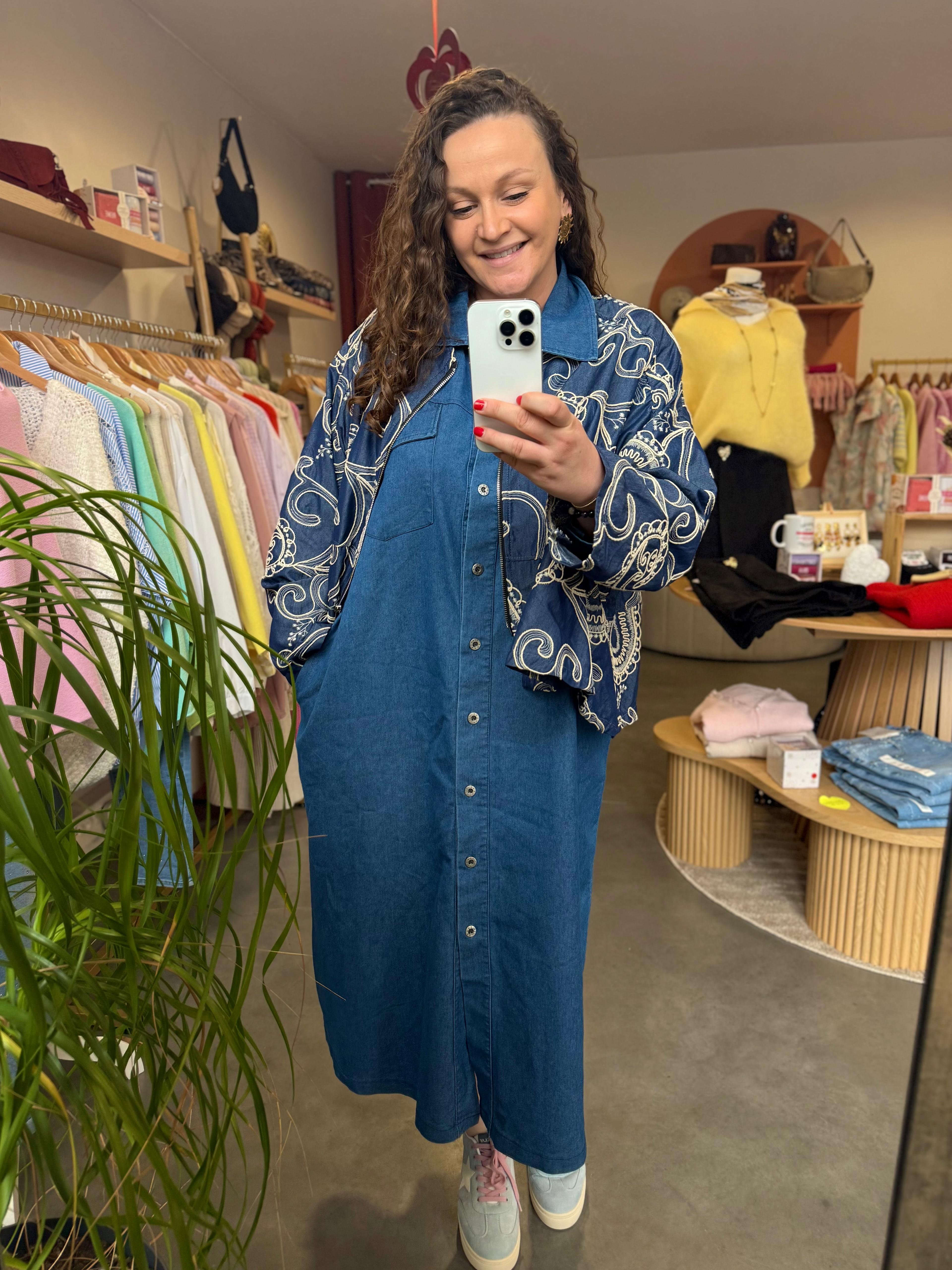 Cette veste est une véritable pièce de caractère qui allie l'authenticité du denim au raffinement des broderies artisanales. Ses motifs "arabesque" sur l'ensemble du vêtement apportent une dimension artistique et lumineuse, transformant un basique en une pièce forte. Sa coupe généreuse et fluide a été pensée pour offrir un confort absolu tout en structurant la silhouette avec modernité.